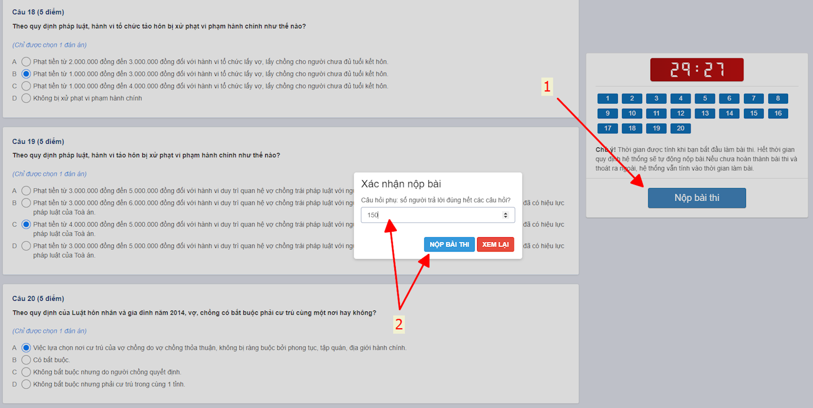 Thí sinh tích chọn vào đáp án mà mình cho là đúng để trả lời. Khi trả lời xong tất cả các câu hỏi, thí sinh nhất nộp bài để trả lời thêm câu hỏi phụ.